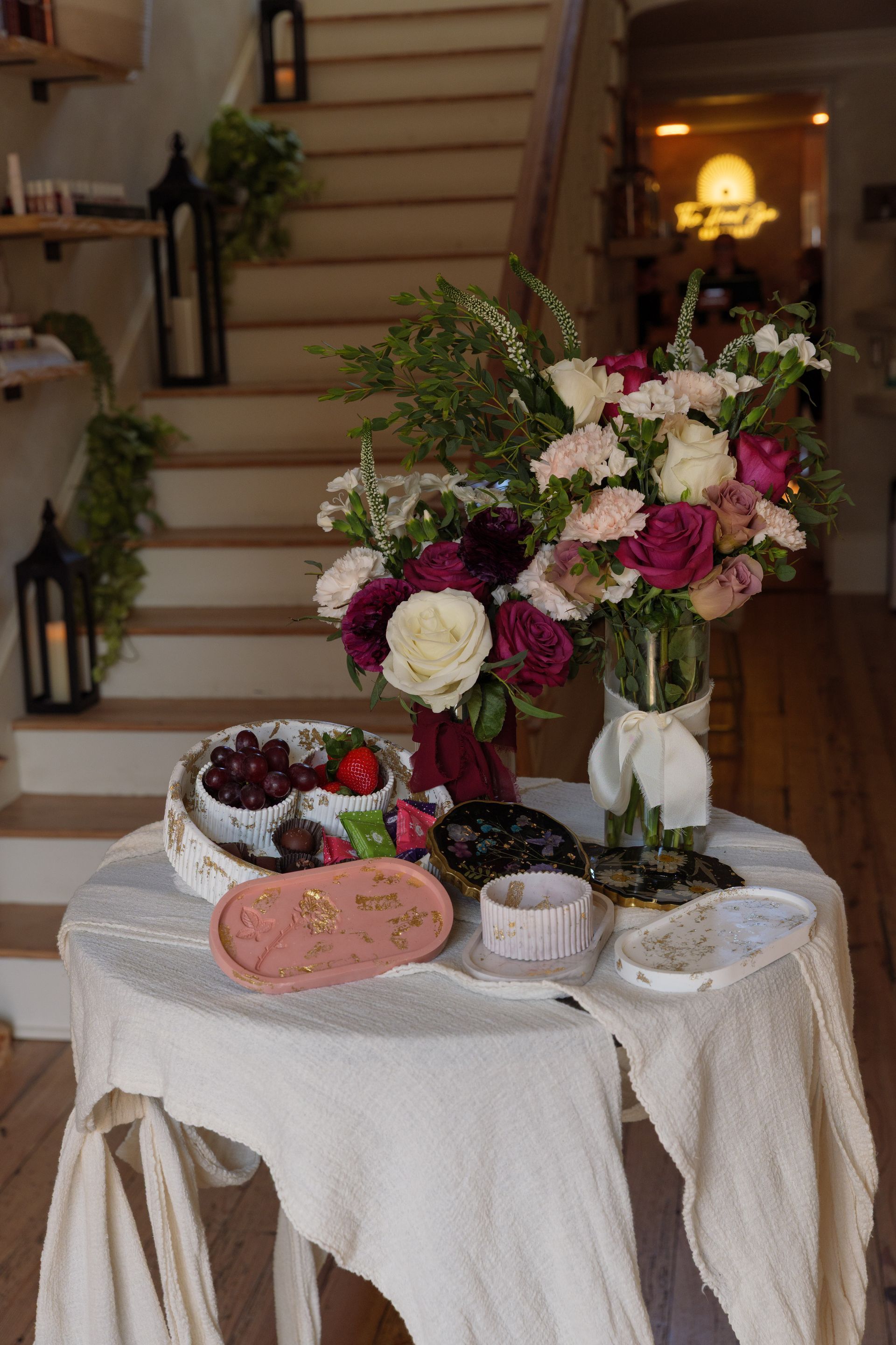 Enjoy fresh fruit and Vosges Haut-Chocolat, paired with a floral arrangement and a handcrafted coaster set to take home, custom Ethereal Designs coaster set, thoughtfully created by the spa owners using epoxy or mineral-based casting, with elements such as pressed florals, botanical inclusions, or hand-poured ink designs—making every piece completely one-of-a-kind.