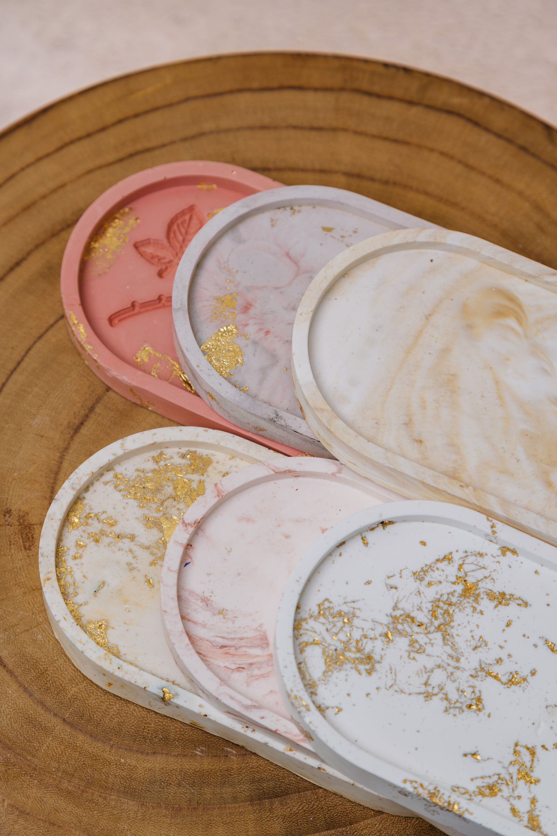 Using epoxy and mineral-based casting techniques, every design is individually poured and composed by hand. No two pieces are alike—each one reflecting a unique balance of texture, tone, and natural elements.