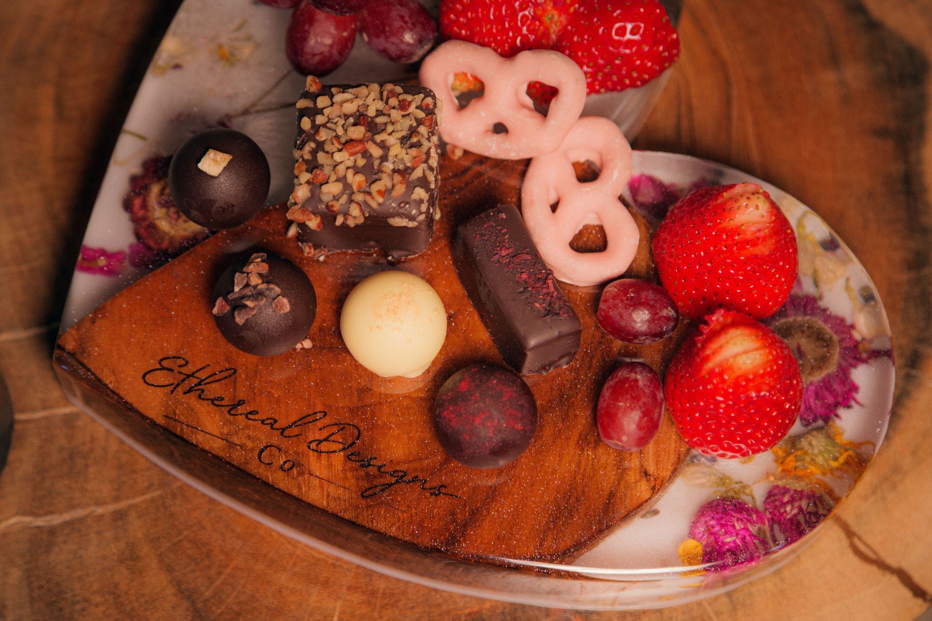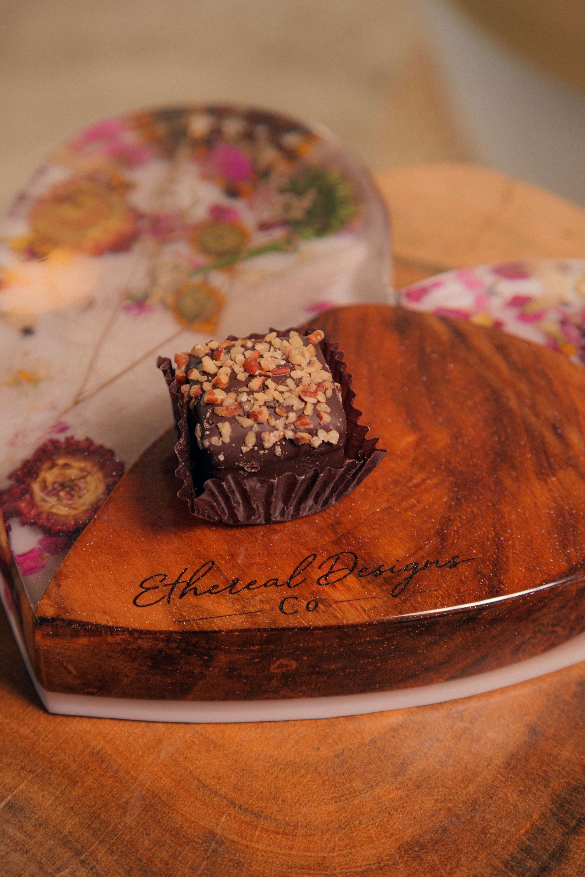 Elevate your Build Your Own Spa Day experience with an exclusive add-on: a one-of-a-kind, locally made wood epoxy charcuterie board. Served with indulgent Vosges Haut-Chocolat truffles and bars sourced from Chicago. This keepsake transforms your experience into a memorable ritual—and goes home with you as a lasting reminder of your time at The Sanctuary.