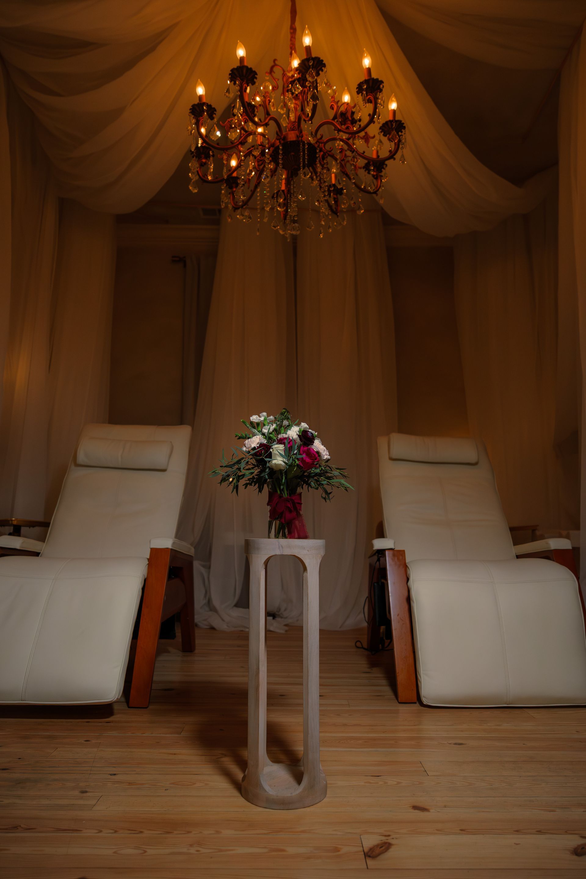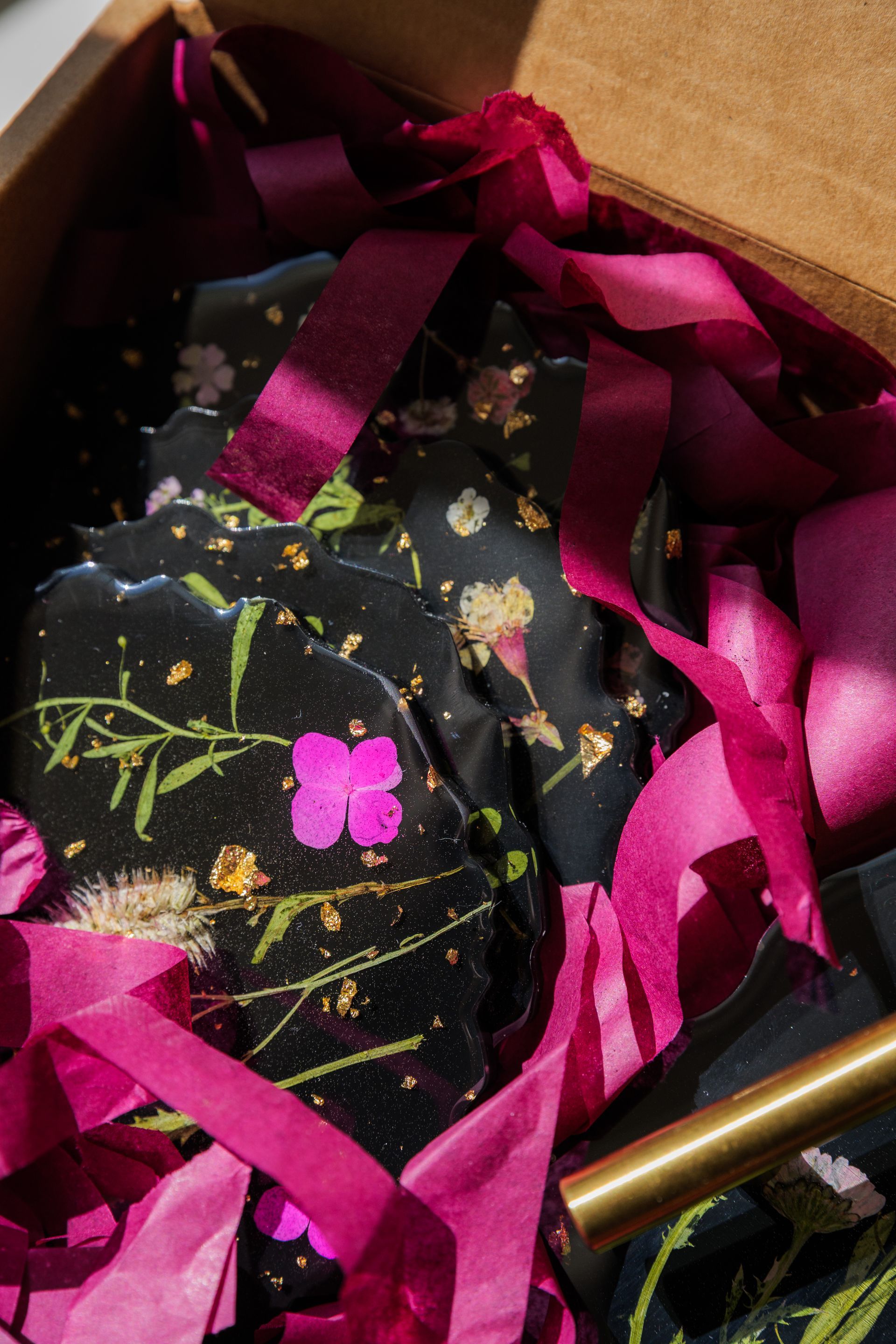 Enjoy fresh fruit and Vosges Haut-Chocolat, paired with a floral arrangement and a handcrafted coaster set to take home, custom Ethereal Designs coaster set, thoughtfully created by the spa owners using epoxy or mineral-based casting, with elements such as pressed florals, botanical inclusions, or hand-poured ink designs—making every piece completely one-of-a-kind.