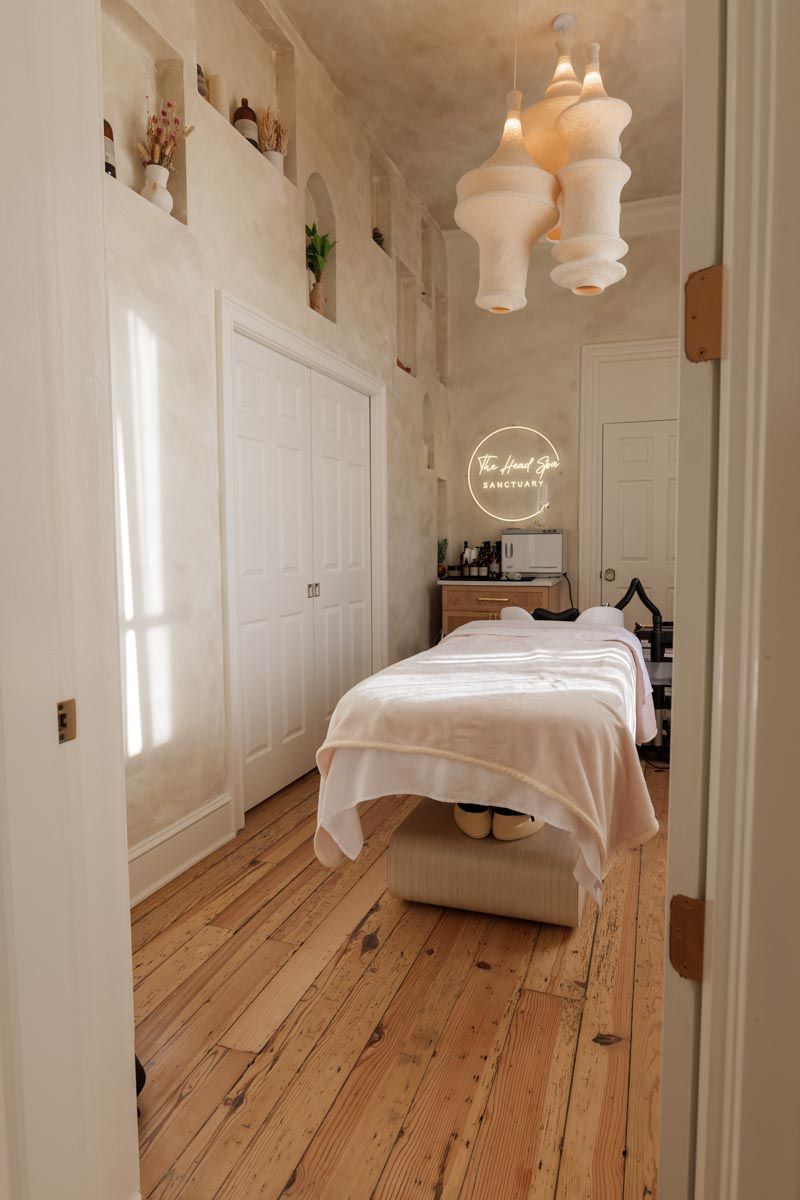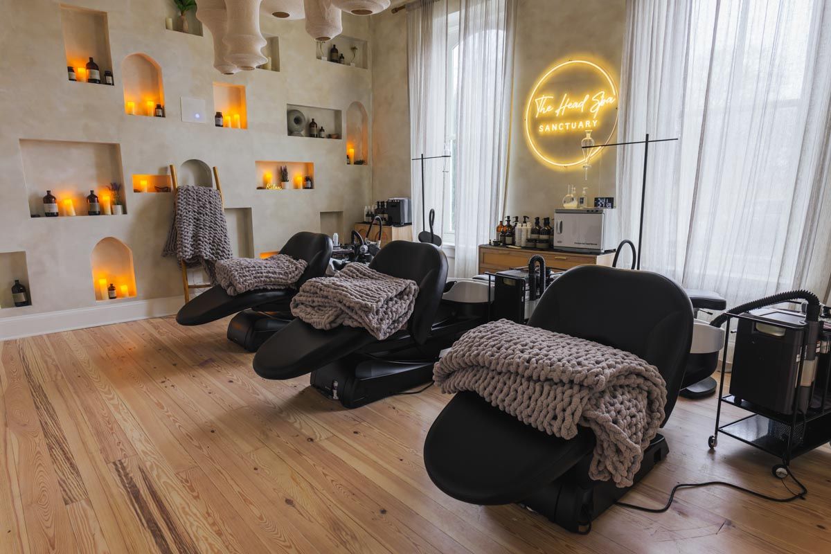 At The Head Spa Sanctuary, every Japanese Head Spa begins with organic tea and cozy spa comforts like plush robes, socks, and a soothing blanket. Enjoy a personalized scalp treatment with deep exfoliation, micro mist therapy, and a calming shiatsu shampoo. End with our Hydro-dhara ritual, Flowerfall toner, and your choice of a Jade or Onsen eye mask.