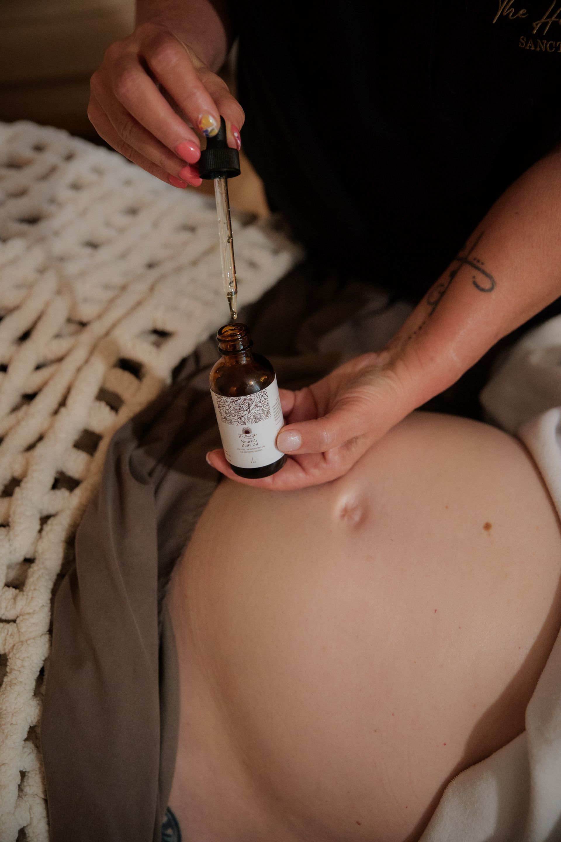 | Included Wellness Gifts | Botanical Belly Oil • Mother’s Oasis Herbal Tea | Nutrafol Shampoo & Conditioner • RootCause Scalp Roller |